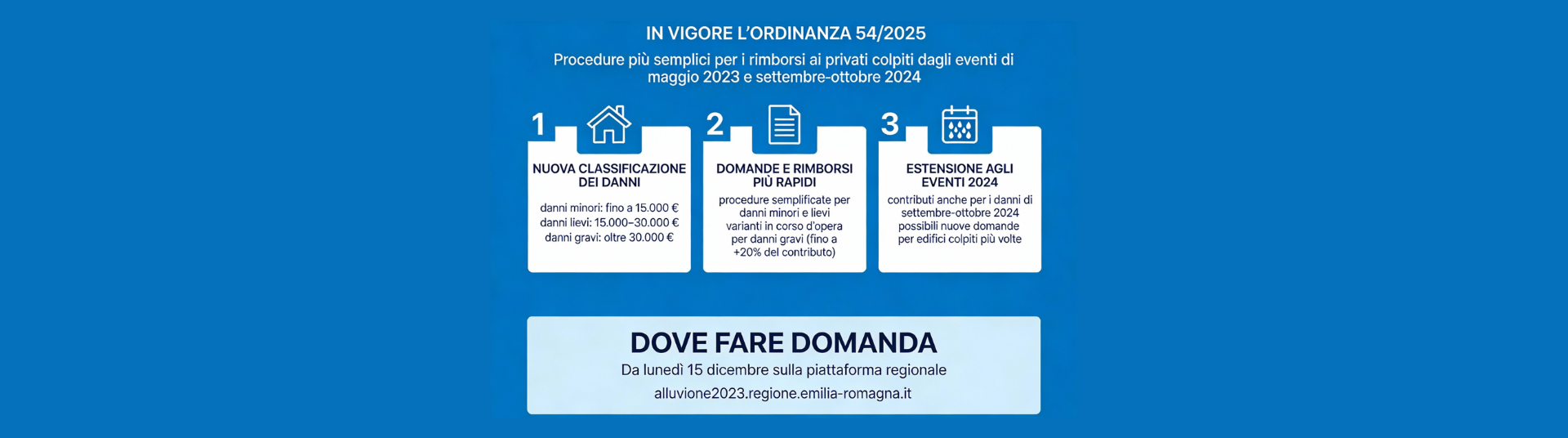 Il Commissario Straordinario alla Ricostruzione ha pubblicato la nuova Ordinanza 54/2025 “Misure per l’integrazione e la semplificazione delle attività di ricostruzione privata” che apporta alcune significative novità per la richiesta di contributi da parte delle persone colpite dagli eventi alluvionali del maggio 2023 e di settembre e ottobre 2024.