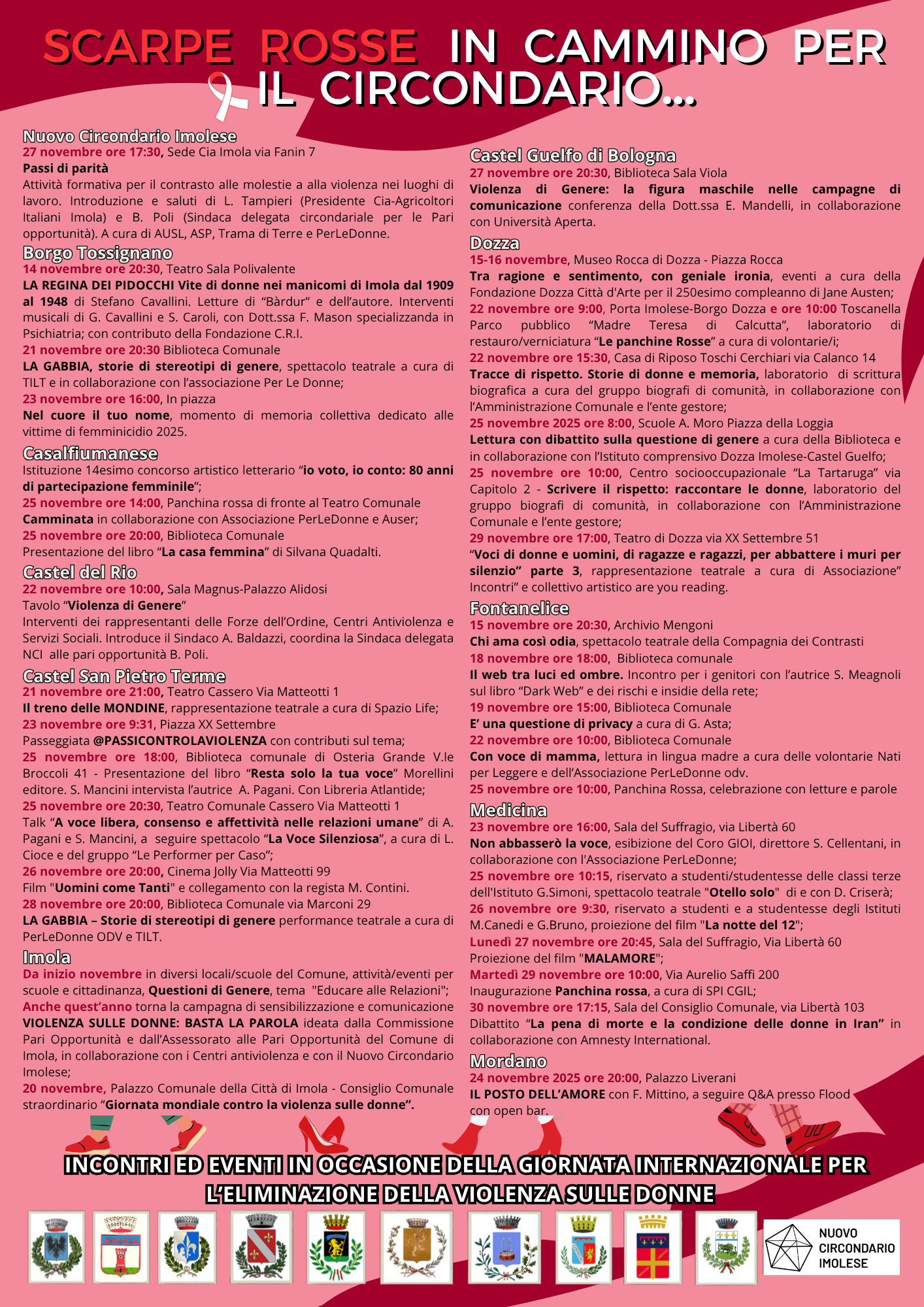 In occasione della Giornata internazionale per l’eliminazione della violenza contro le donne, i Comuni del Nuovo Circondario Imolese, attraverso la Conferenza Assessori Pari Opportunità, hanno elaborato e condiviso un ricco programma di eventi e iniziative di sensibilizzazione e informazione sulla delicata e attuale tematica. Ogni municipio, con le proprie specificità e sensibilità, ha contribuito alla realizzazione di un cartellone eterogeneo di incontri, campagne e momenti di riflessione, con l’obiettivo di rafforzare la consapevolezza collettiva e promuovere una cultura fondata sul rispetto e la parità di genere. Un calendario che i Comuni, passo dopo passo, hanno presentato raccontando i dettagli e le collaborazioni avviate per la la valorizzazione di ogni appuntamento.