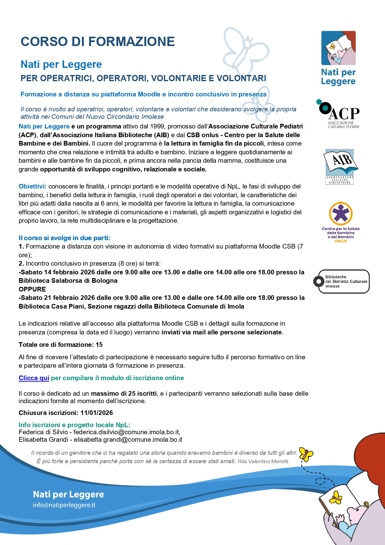 I contenuti formativi riguarderanno il programma “Nati per Leggere”, le sue finalità, l’organizzazione, le azioni di promozione, il ruolo dei volontari e i benefici della lettura.
