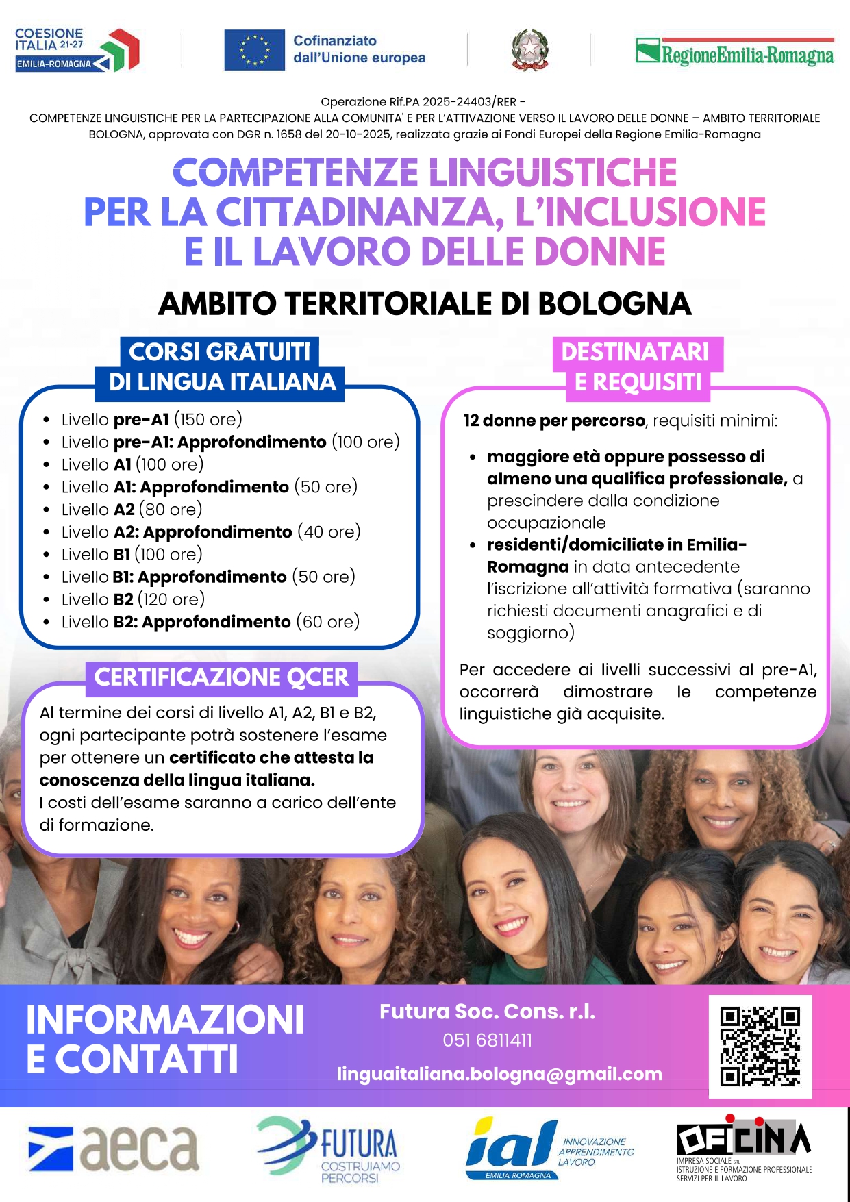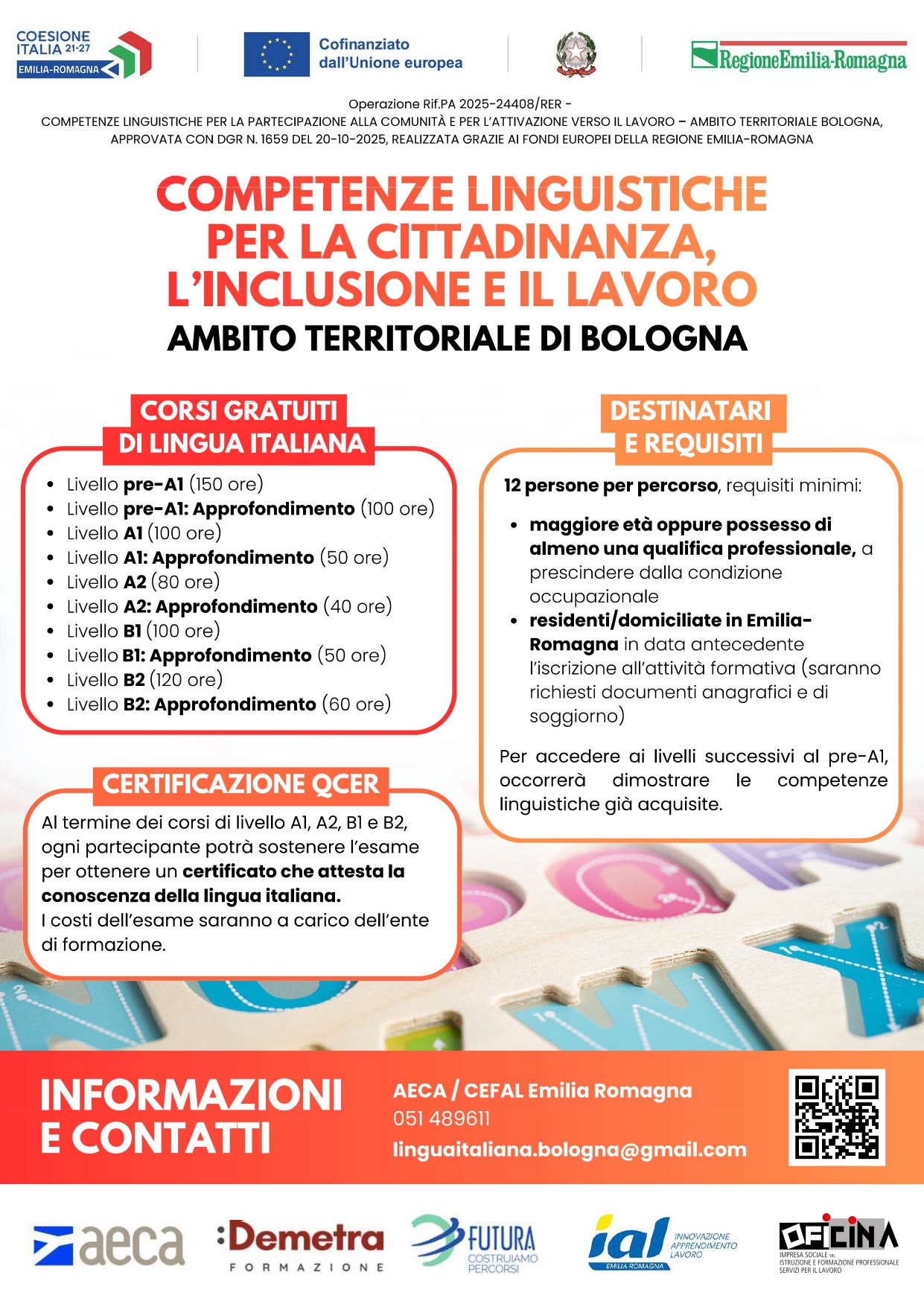 Per informazioni e contatti sono attivi i riferimenti di AECA/CEFAL Emilia Romagna (telefono 051 489611) e di Futura Soc. Cons. r.l. (telefono 051 6811411), oltre all’indirizzo e-mail linguaitaliana.bologna@gmail.com. È inoltre possibile rivolgersi agli enti partner indicati nei materiali informativi o compilare il form online dedicato ai corsi gratuiti di italiano.