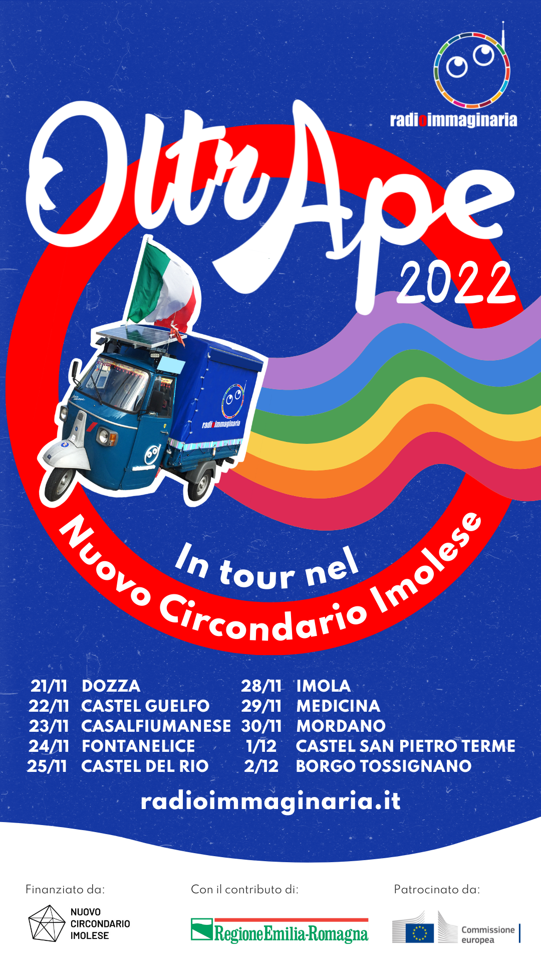 Un vero e proprio tour di un gruppo di speaker adolescenti a bordo dell’ApeRadio di Radioimmaginaria, un Ape del 1970 convertito a bio-metano e adibito a studio radio viaggiante. Il tour ha previsto 10 tappe presso 10 scuole diverse del Circondario Imolese con presentazione del progetto e della propria stazione radio. Al termine, il team della web-radio invitava gli studenti interessati, a partecipare ad una simulazione di radio trasmessa dall’ApeRadio che nel pomeriggio stazionava in un luogo centrale o di interesse del Comune di tappa.